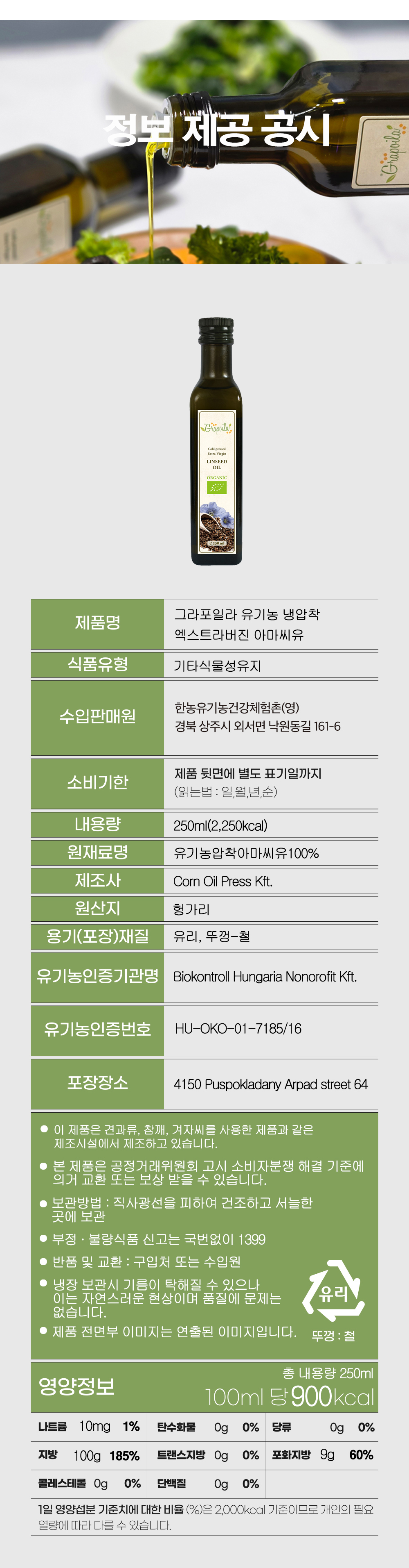 식품의 유형기타식물성유지 내용량250ml 원산지헝가리 원재료명 및 함량유기농 압착아마씨유 100% 소비기한제품 상단 별도 표기 일 까지 보관방법/섭취방법제품설명서 하단에 적시 수입원 및 판매원한농유기농건강체험촌(영) 경북 상주시 외서면 낙원동길 161-6 소비자 상담실054-535-7090